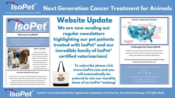 We have updated our website to include regular newsletters to share the heartwarming stories and pictures of our pets saved with IsoPet® Precision Radionuclide Therapy™. Subscribe and you will be automatically entered to win our monthly draw for an IsoPet® tote!