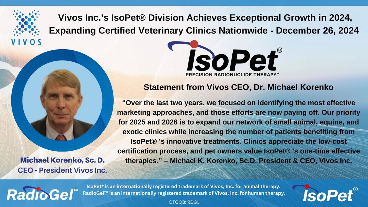 (Richland, WA – December 26, 2024) – Vivos Inc. (OTCQB: RDGL) is pleased to announce the significant achievements of its IsoPet® Animal Cancer Division, setting new milestones in veterinary cancer care, and expanding its network of certified clinics across the U.S.
